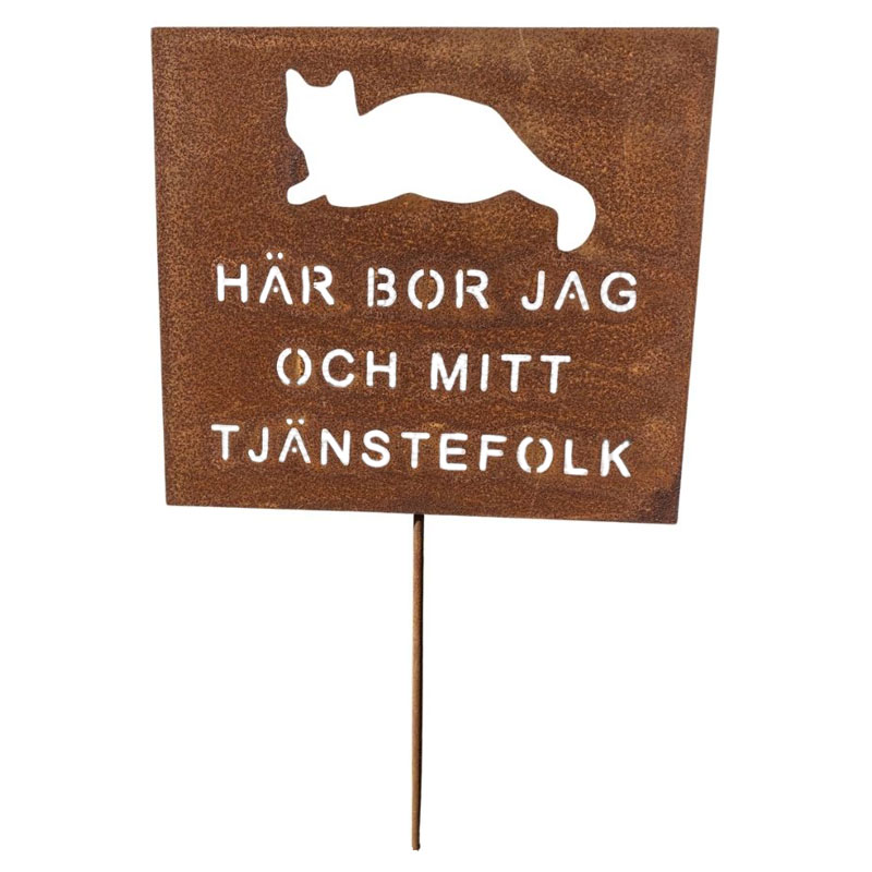 Rolig skylt från Lind Decoration med en utstansad katt och texten "Här bor jag och mitt tjänstefolk".