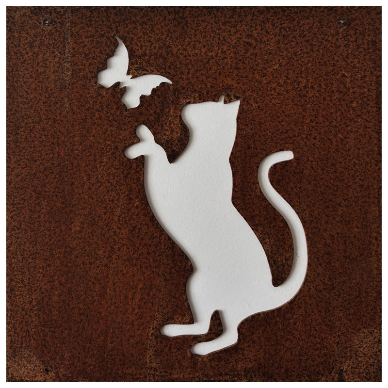 Fin skylt till armeringsnät från Lind Decoration, med utstansat motiv av en katt och en fjäril.