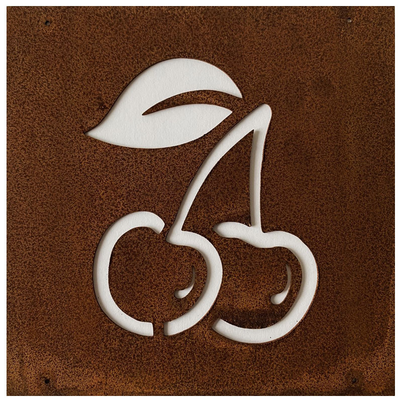 Fin skylt till armeringsnät från Lind Decoration, med utstansat motiv av en klase med körsbär.