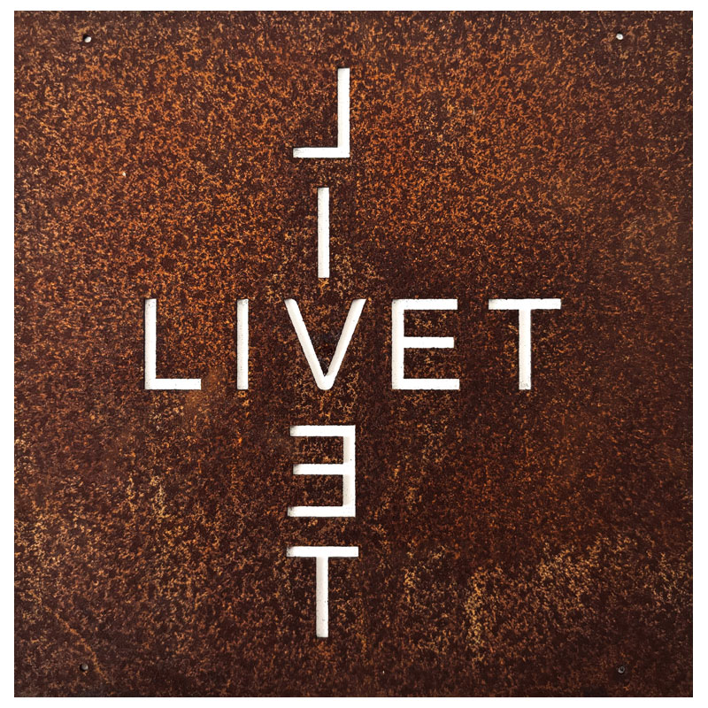 Fin skylt till armeringsnät från Lind Decoration, med ordet "Livet" utstansat både lodrätt och vågrätt.