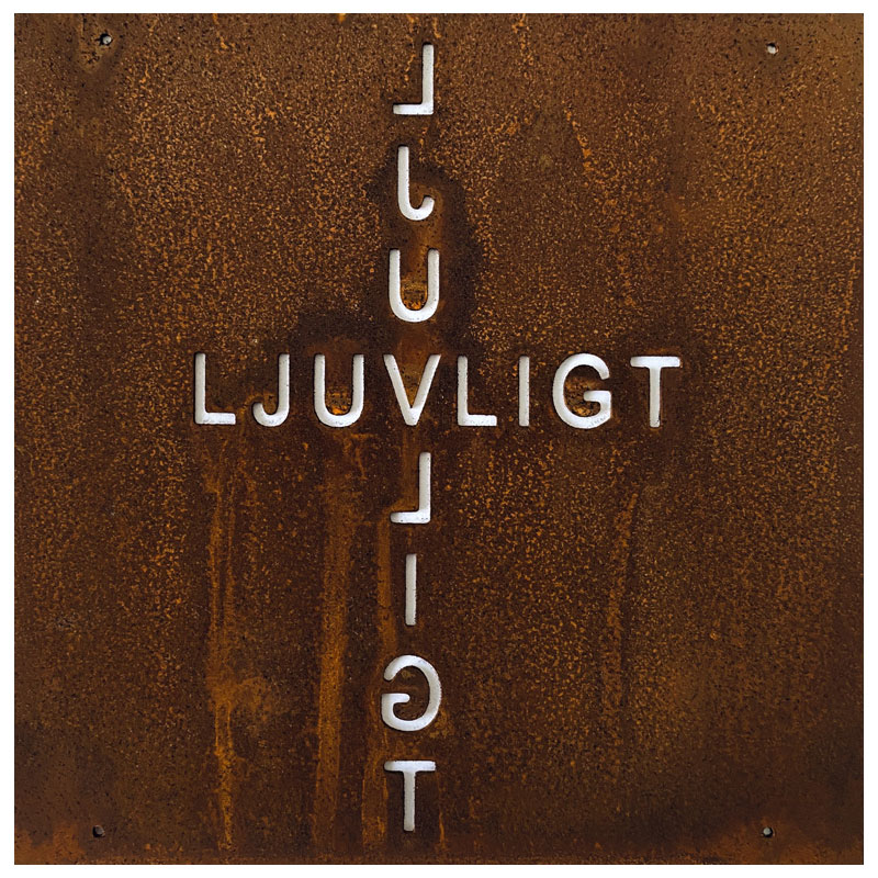 Fin skylt till armeringsnät från Lind Decoration, med ordet "Ljuvligt" utstansat både lodrätt och vågrätt.