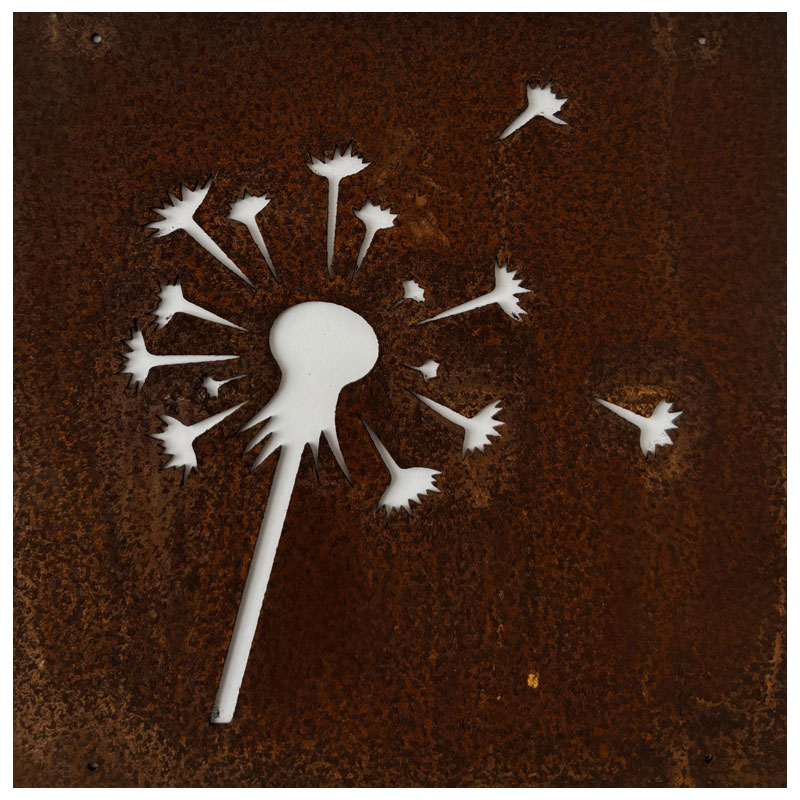 Fin skylt till armeringsnät från Lind Decoration, med utstansat motiv av en överblommad maskros vars fröer blåser iväg i vinden.