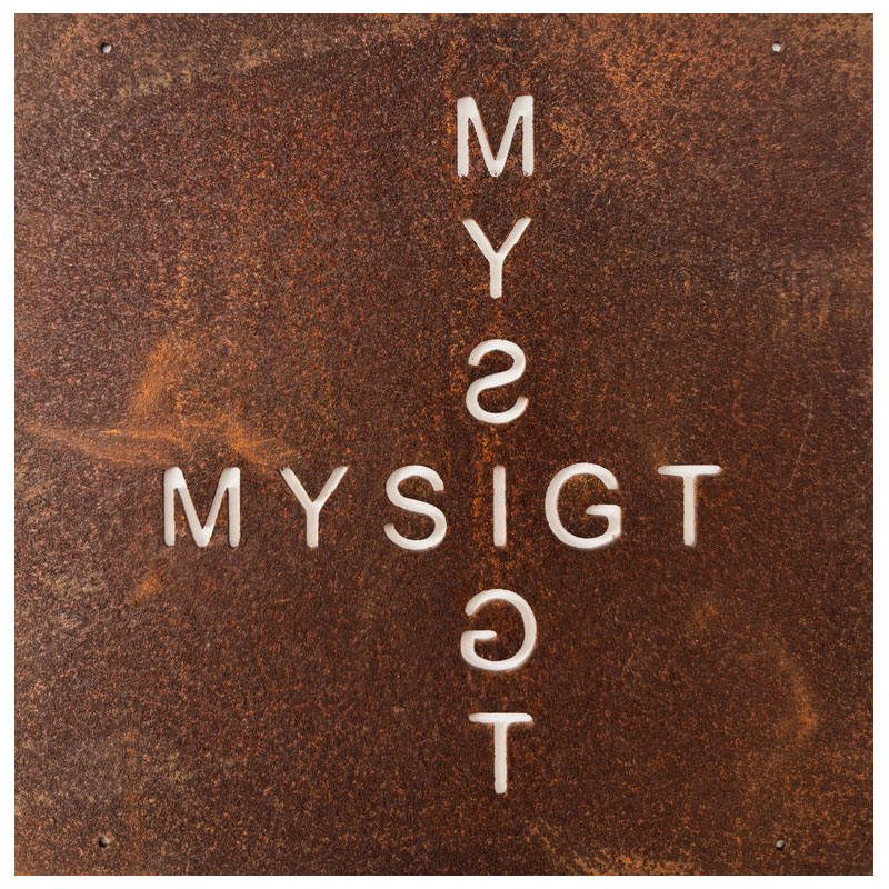 Fin skylt till armeringsnät från Lind Decoration, med ordet "Mysigt" utstansat både lodrätt och vågrätt.