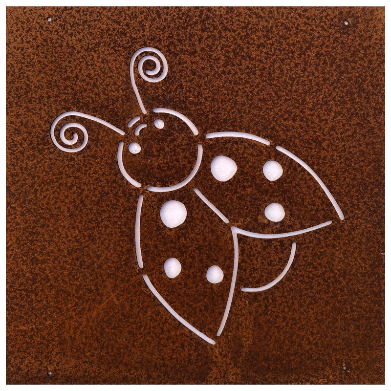 Fin skylt till armeringsnät från Lind Decoration, med utstansat motiv av en nyckelpiga.