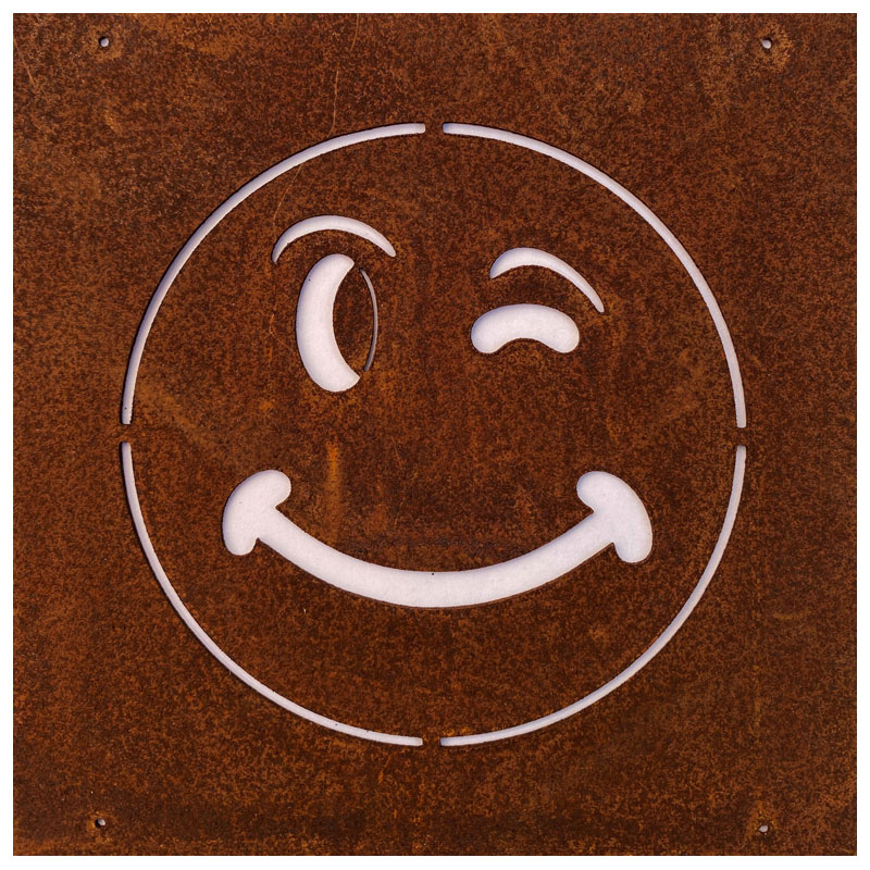 Fin skylt till armeringsnät från Lind Decoration, med utstansat motiv av en blinkande smiley.