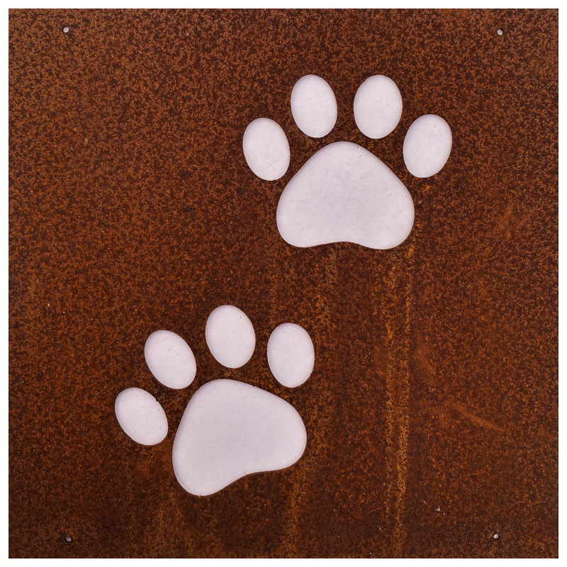 Fin skylt till armeringsnät från Lind Decoration, med utstansat motiv av två tassar.