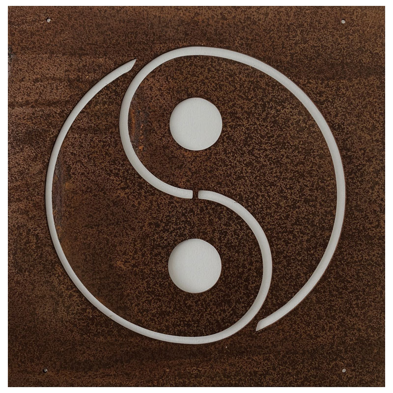 Fin skylt till armeringsnät från Lind Decoration, med utstansat motiv av en Yin och Yang-symbol.