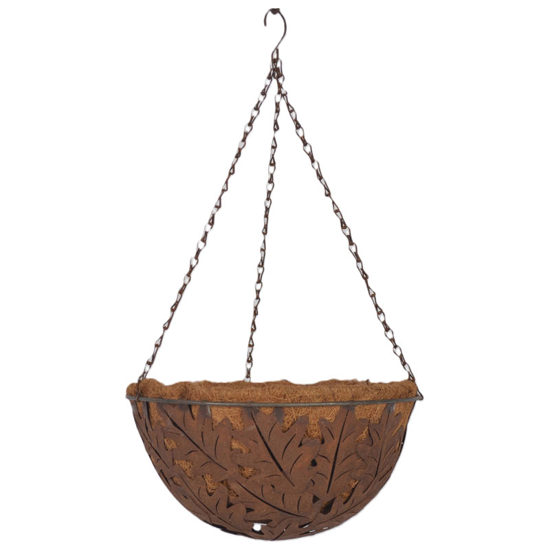 Vacker ampel från Lind Decoration som pryds av ekblad, med en kokosskål att plantera i på insidan.