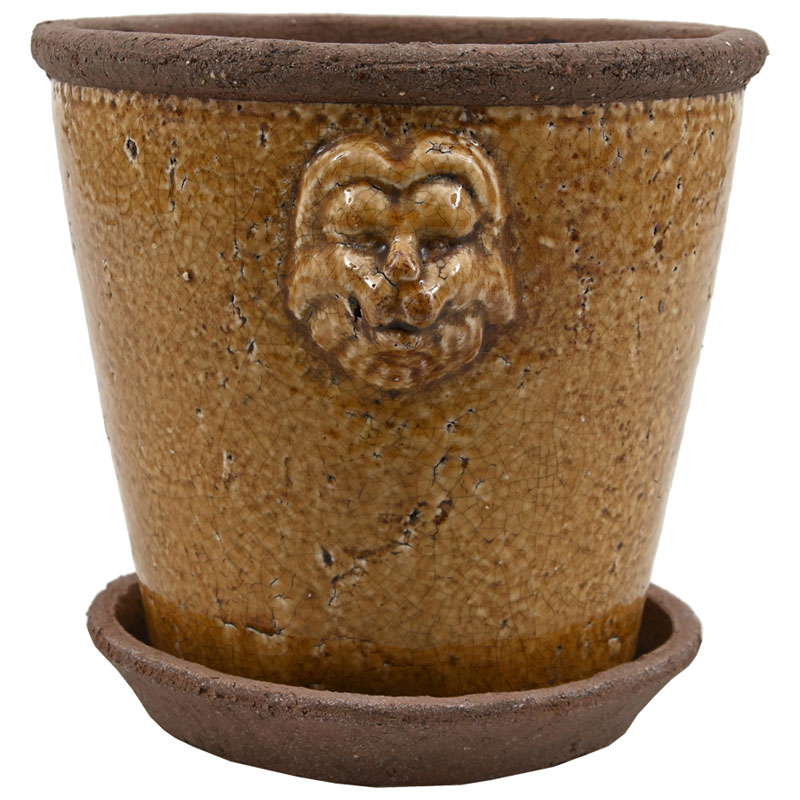Snygg rustik kruka i terrakotta med lejonmotiv och fat från Miljögården.