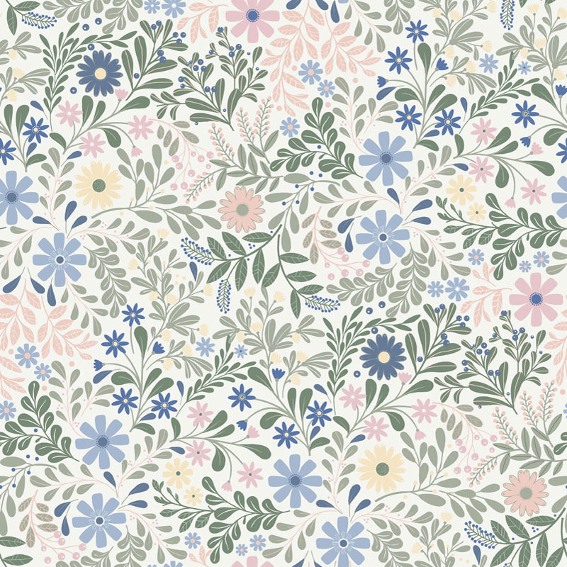 Vacker akrylatbehandlad textilvaxduk på metervara, prydd av blommor och blad i pastell.