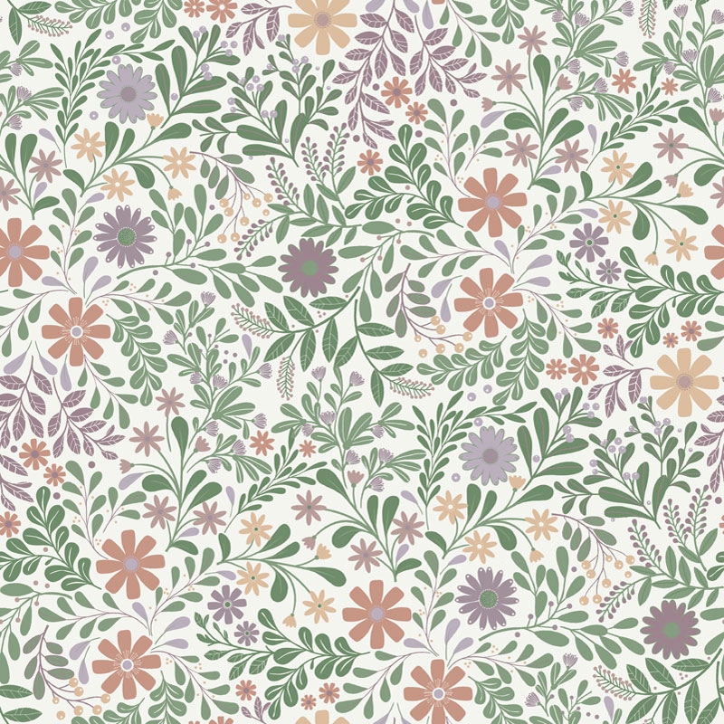 Vacker akrylatbehandlad textilvaxduk på metervara, prydd av blommor i persika och lila mot en vit botten.