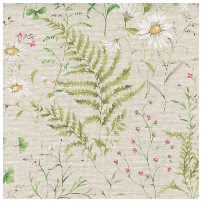 Vacker textilvaxduk på metervara från Florista. Prydd av ett vackert botaniskt mönster mot en beige botten.