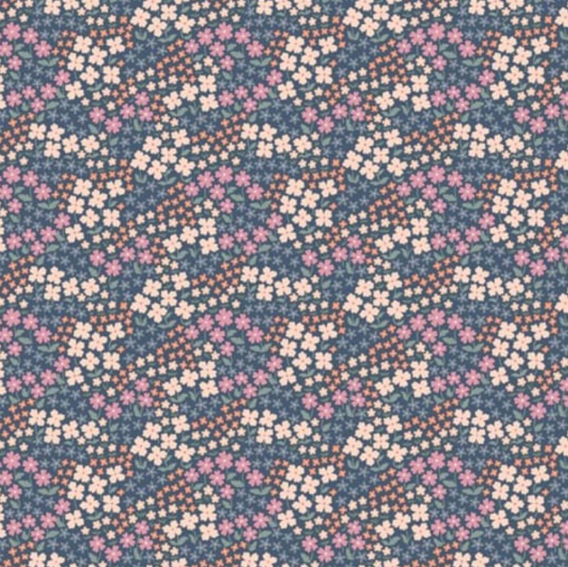 Charmig vaxduk från Ernst Textil, prydd av ett småblommigt mönster i nyanser av mörkblått, rosa och lila.